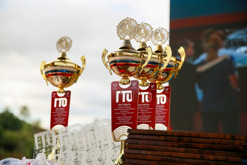 Для фестиваля 2025 года мы изготовили наградную и текстильную продукцию. Кубки с государственным триколором на чашах имеют металлические вырезные стемы с символикой комплекса и фестиваля, навершия на крышках повторяют знак отличия ГТО.